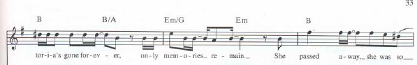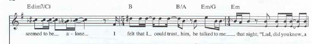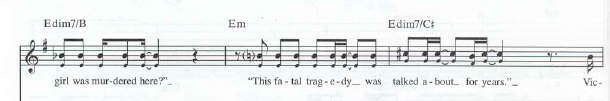 Основной голос основан на разработки одного звука. Обратите также внимание на логичное повышение интонации, которое начинается в третьем такте и идет по звукам альтерированного E минора. Я уже упоминал о том, что данный тип мелодики используется в речитативах.