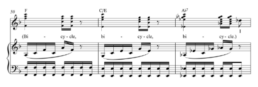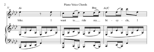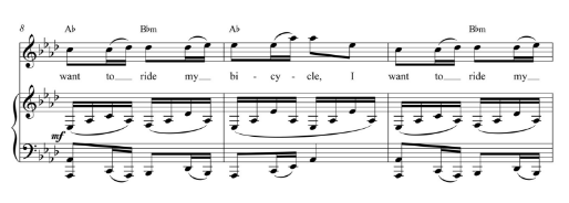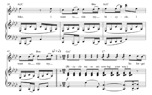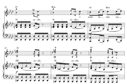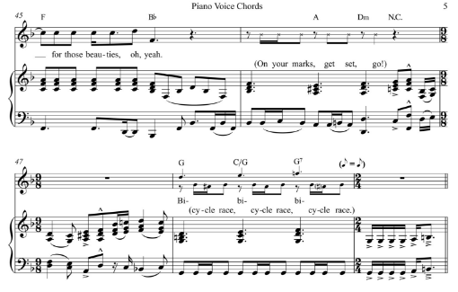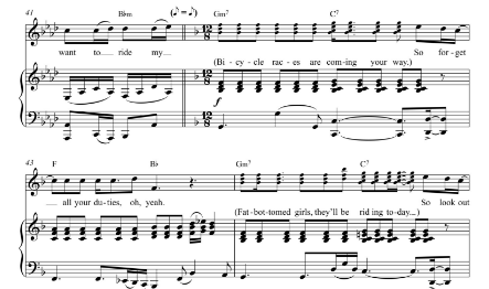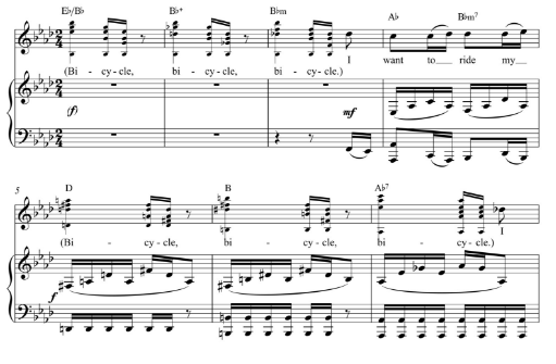 Песня Bicycle Race является отличным примером того, как можно использовать максимально сложные музыкальные концепции и при этом не выходить за рамки поп-музыки. Я хотел бы рассмотреть эту песню в первую очередь с позиции модуляций и отклонений, так как эта песня действительно редкий пример использования 5 (!) тональностей в одной песне. При этом здесь нет банальных и предсказуемых для поп музыки сдвигов на полтона-тон.
