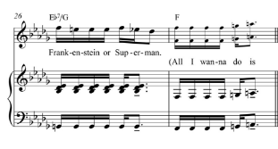 Контекст песни в дальнейшем покажет, что весь оборот припева находится в пределах Ab мажора, но во вступлении тональная неопределенность используется для того, чтобы перейти в тональность максимально далекой степени родства D мажор ( D для Ab это 3 степень родства).