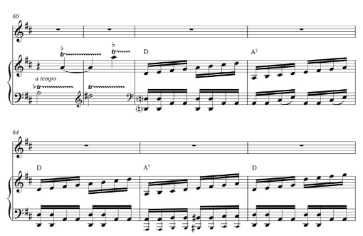 Затем мы видим полное повторение оборота. Во втором проведении вводится мажорная субдоминанта Eb7, которая логично приводит нас в D