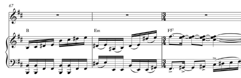 При этом здесь используется эллипсис — субдоминанта исходной тональности (Bbm) переходит в T другой (D). Дальнейшее гармоническое движение основано не на логике тональных тяготений, а на логике движения баса. Вы можете увидеть, что это нисходящее движение по уменьшенному трезвучию от G# ( D-B-G#).
