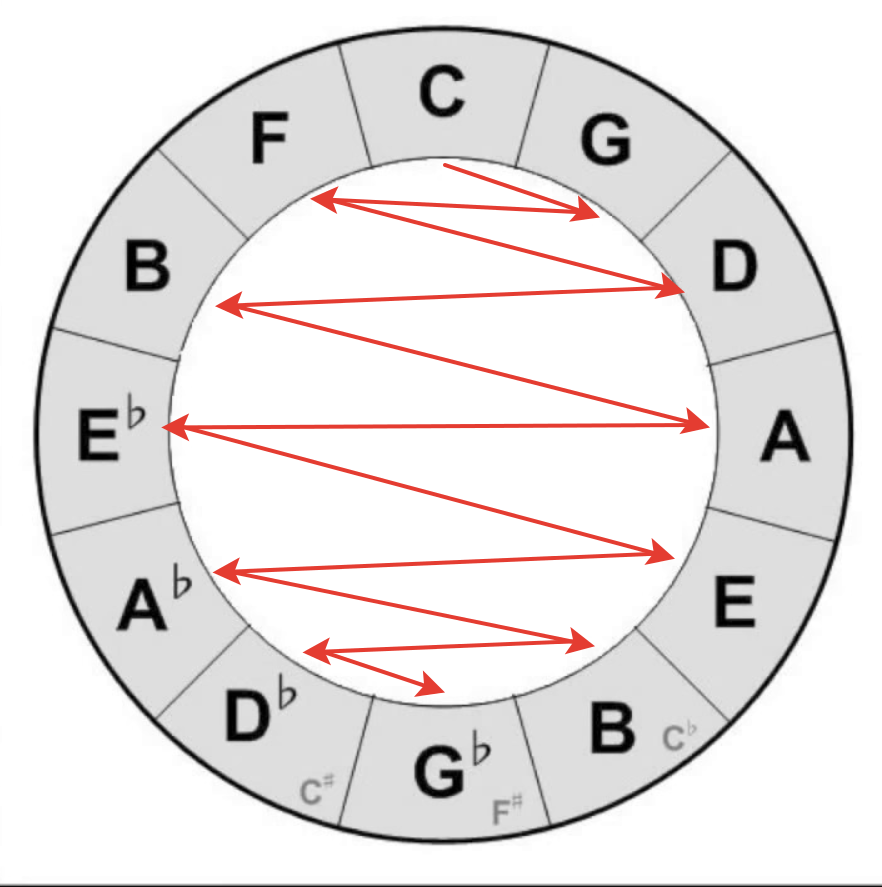 Не сложно заметить, что эти тональности мы можем найти в квинтовом круге. По сути, здесь идет движение по квинтам в разные стороны. Сравните: