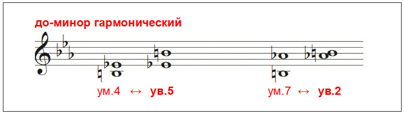 Заметьте, что у пар характерных интервалов, которые являются обращениями друг друга: ум.4 ↔ ув.5   и ум.7 ↔ ув.2 , — разрешения тоже являются обращениями друг друга: м.3 ↔ б.6  ,  ч.4. ↔ ч.5